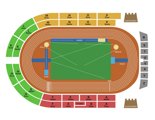 Plats Stockholm Stadion. Vi har platser i sektion N övre - under tak, rad 14-18.