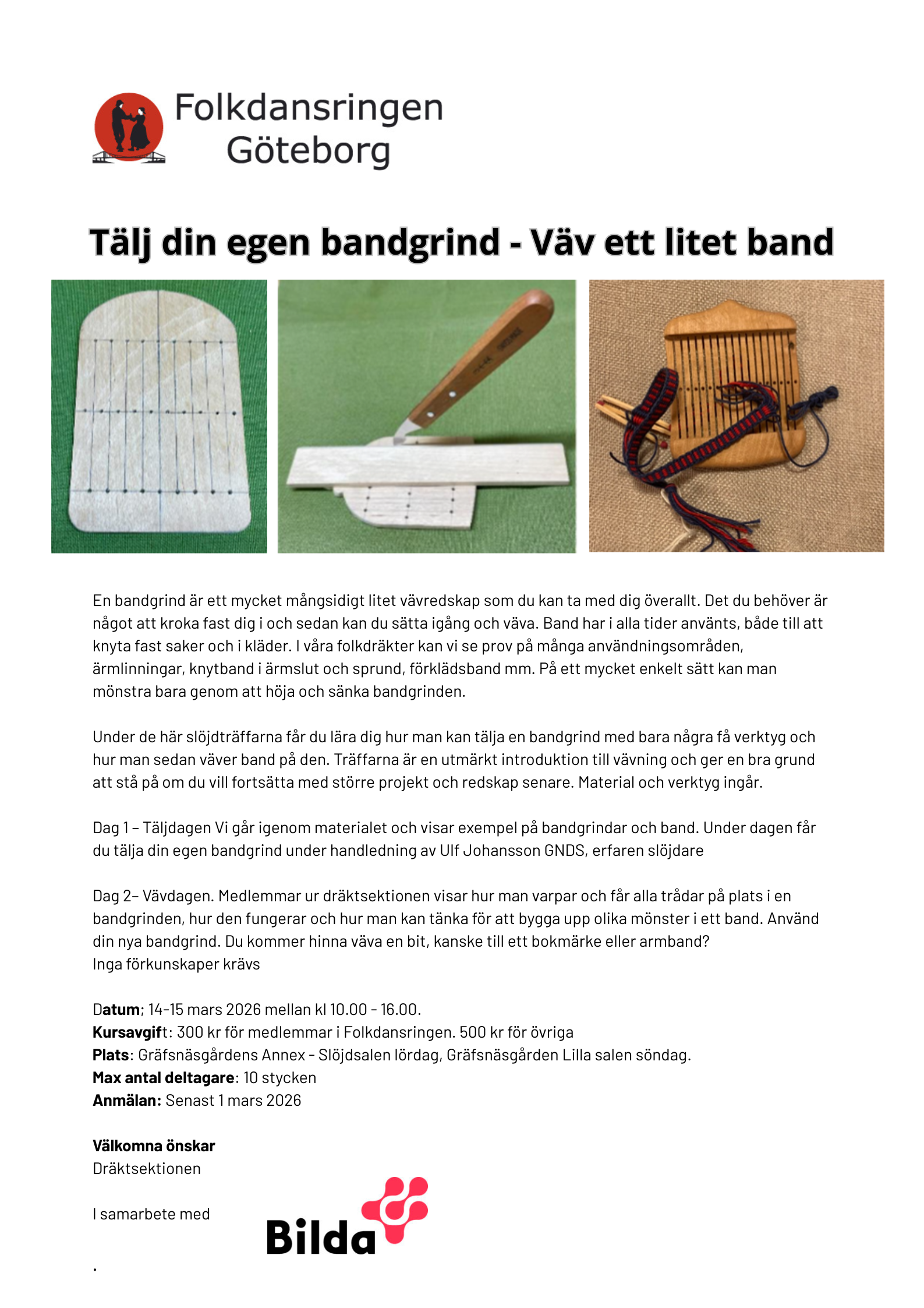 Dag 2– Vävdagen. Medlemmar ur dräktsektionen visar hur man varpar och får alla trådar på plats i en bandgrinden, hur den fungerar och hur man kan tänka för att bygga upp olika mönster i ett band. Använd din nya bandgrind. Du kommer hinna väva en bit, kanske till ett bokmärke eller armband?