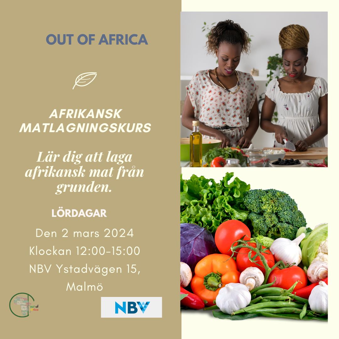 Varje lördag på våren 2024 bjuder Out of Africa in afrikansk matlagning från grunden. Matupplevelserna kommer att hämta inspiration och göras utifrån traditionerna i matlagning från Gambia, Senegal, Nigeria, Kenya, Tanzania, Kamerun, Guinea Conakry, Ghana med mera länder från Afrika. Det kommer att finnas möjlighet att laga både vegetariskt eller kött/fisk.