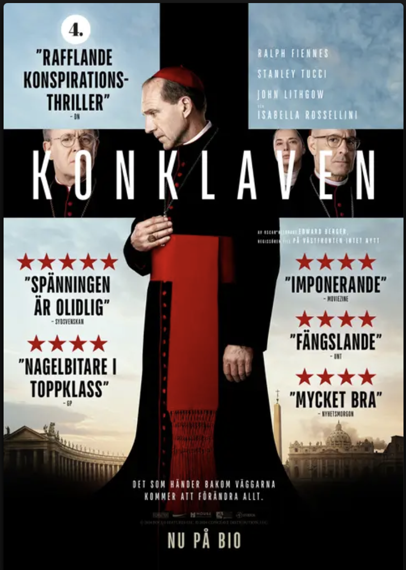 I Edward Bergers (På västfronten inget nytt) Konklaven får vi följa en av världens mest hemliga och historiska händelse – att välja ny påve. Efter att den älskade påven oväntat avlidit får kardinal Lawrence (Ralph Fiennes) ansvaret att leda den hemliga processen. När den katolska kyrkans mäktigaste ledare har samlats och är inspärrade i Vatikanen hamnar Lawrence mitt i en konspiration och upptäcker hemligheter som kan skaka kyrkans grundvalar.