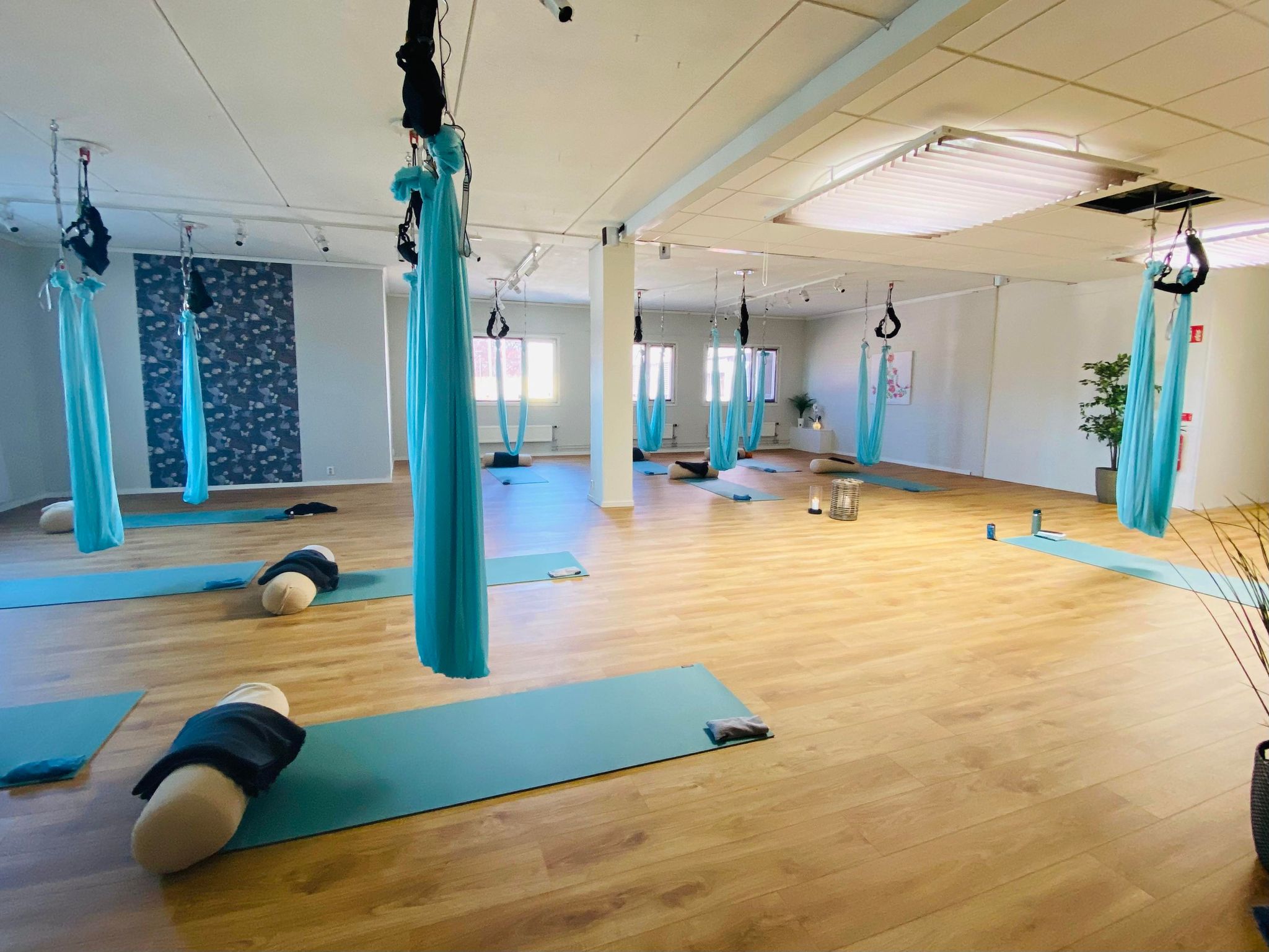I aerial eller svävande yoga hänger du en bit ovanför golvet i en specialutvecklad hängmatta som tillåter oss att hålla positionerna en längre stund. Många upplever betydligt mindre belastning i ryggen i denna typ av flygande yoga. Med hjälp av gravitationen, kommer vi åt våra leder och ligament och tyget ger kroppen extra stöd. I dessa pass aktiverar vi främst höfterna, bäckenet, låren och ryggen. Vi kombinerar lång vila i de olika positionerna i 2-6 minuter med några kortare övergångspositioner. Genom djup avslappning aktiveras vårt parasympatiska nervsystem. Vi avslutar varje pass med stilla vila i vår sköna kokong.